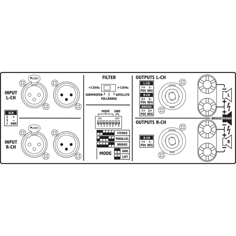 The MONACOR STA-2200 is an advanced stereo PA amplifier, perfect for demanding audio applications. Equipped with Class H technology and a performance-optimized power supply, it delivers reliable and powerful performance. With a peak output of 4,000 W and a rated output of 2,200 W, the STA-2200 offers sufficient power for professional PA systems. The amplifier supports various operating modes (stereo, parallel, bridged) and features an integrated crossover network with an adjustable frequency of 120 Hz, ideal for subwoofer, full-range, or satellite operation.